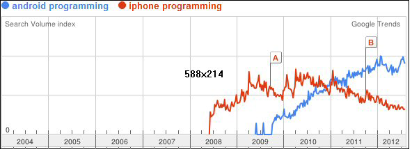 Faktor berikutnya adalah trend pencarian Google, dimana semakin banyak orang mencari topik tentang pemrograman android ketimbang Iphone, kenapa? Ada banyak faktor, salah satunya adalah karena memang Android lebih terbuka dalam hal pengembangan aplikasi ketimbang IPhone