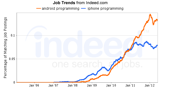 Faktor berikutnya adalah lowongan kerja. Grafik di bawah ini menujukan perbandingan perusahaan yang membutuhkan kemampuan pemrograman Android dibandingkan dengan IPhone.