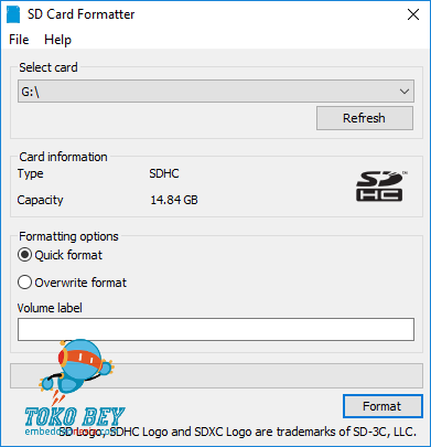 Format terlebih dahulu micro sd card yang akan digunakan menggunakan SD Memory Card Formatter yang dapat diunduh di tautan ini. Pasang microsd ke slot sd card deader jika notebook yang digunakan memiliki slot microsd card. Jika tidak, pengguna dapat membeli sd card reader secara terpisah dan menghubungkan melalui port usb.