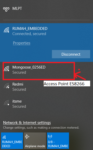 Setelah selesei, ESP8266 akan beralih ke mode AP dengan sebuah SSID yang sama dengan ID device. ID device pada environment yang digunakan penulis terbaca pada esp8266_0256ED. Nilai ini bisa jadi berbeda dengan masing – masing device