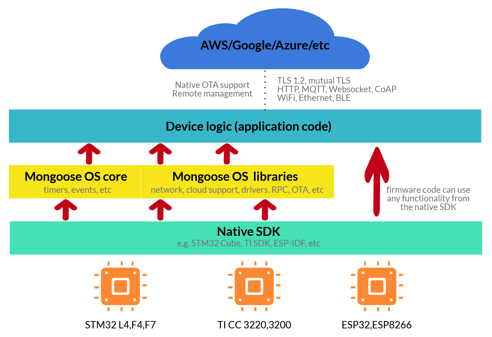 Mongoose OS adalah framework yang berguna untuk membangun aplikasi firmware untuk mikrokontroler berdaya rendah yang terdiri dari komponen utama sebagai berikut