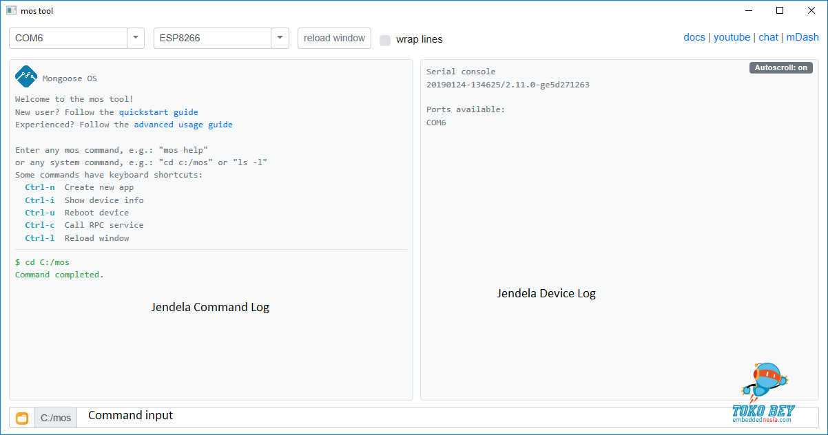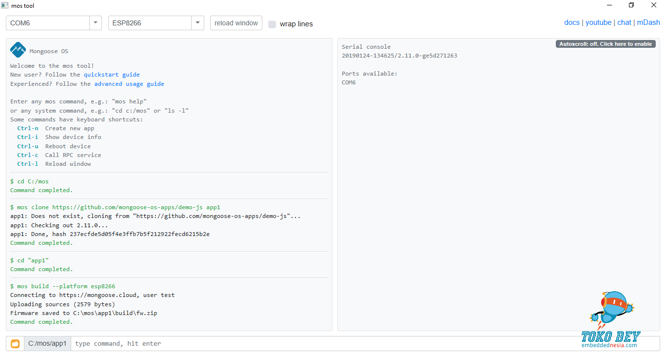 Mongoose OS menggunakan mos tool untuk beranekaragam tugas seperti building hingga flashing firmware. mengelola device hingga menghubungkannya dengan layanan cloud. Mos tool dapat diunduh di situs resminya di tautan ini.