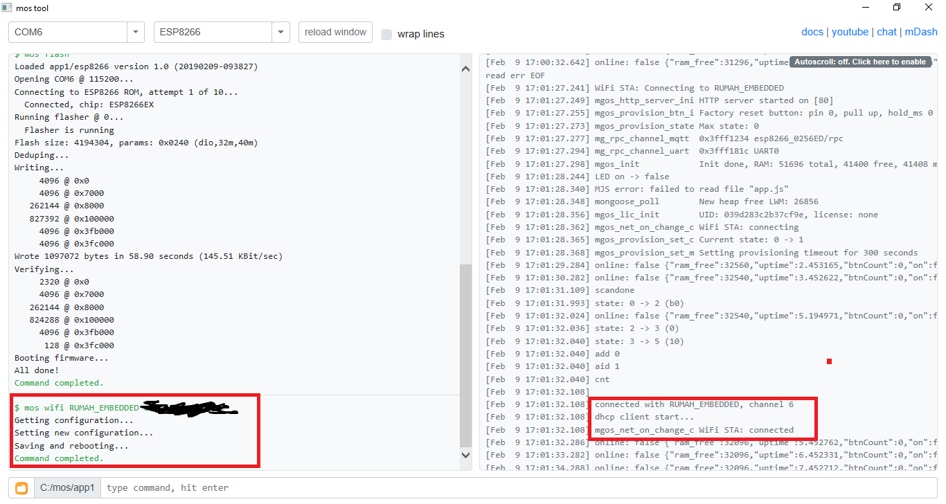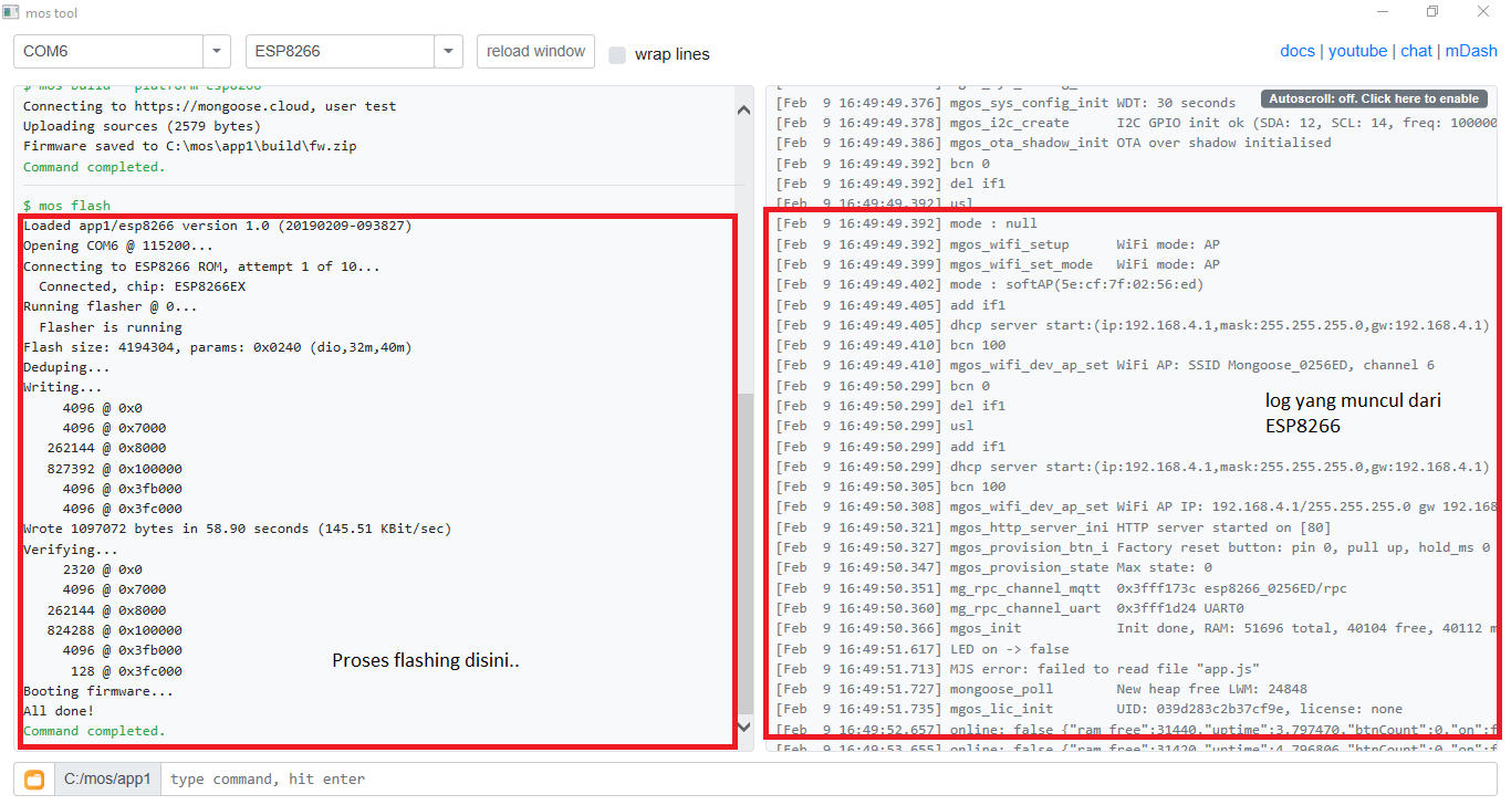 Setelah proses build selesei, binary firmware berada di build/fw.zip. Kini, untuk melakukan flashing ketikkan mos flash pada command input, lalu enter.