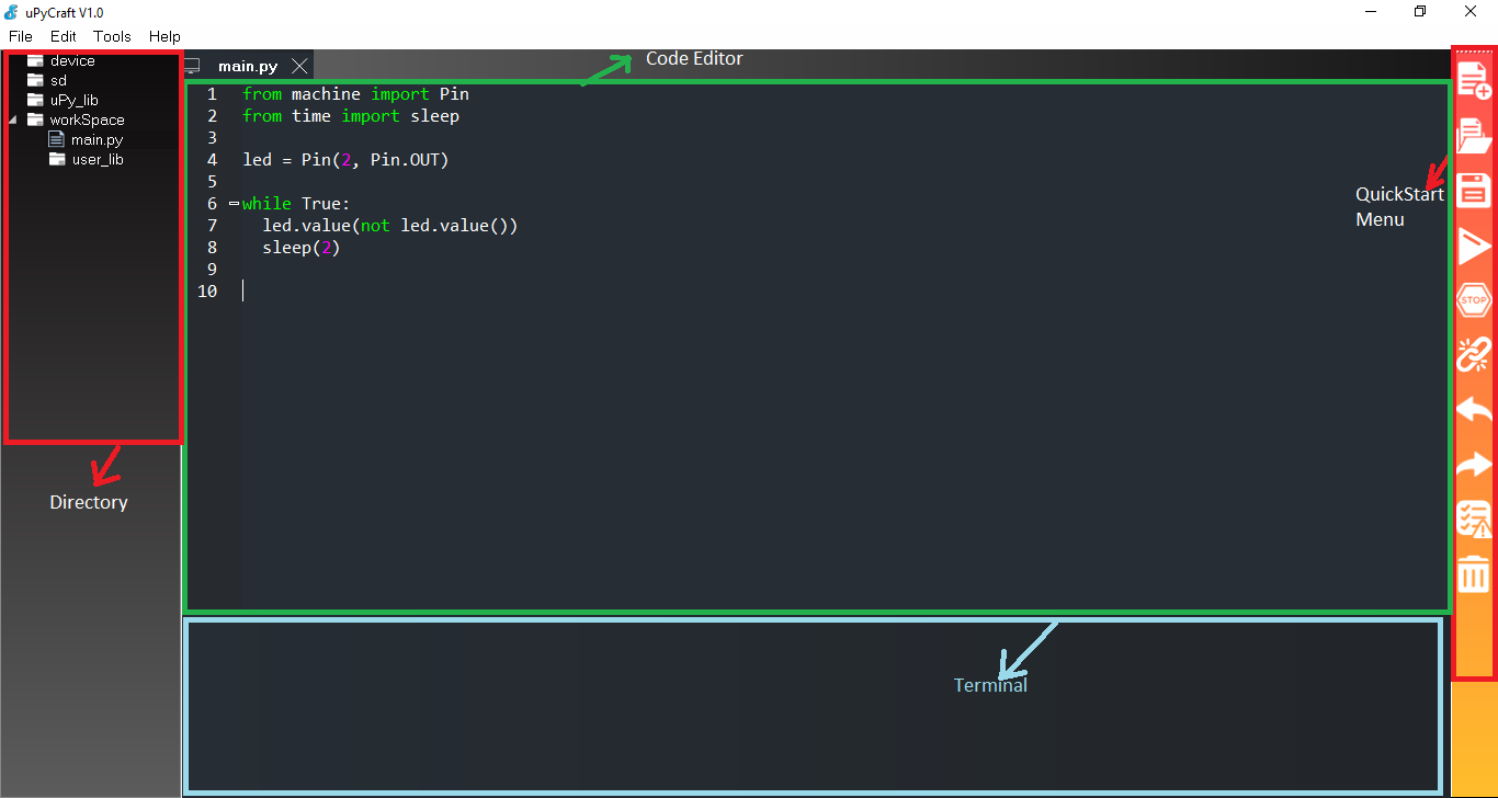 Sebagaimana pada gambar, Tampilan uPyCraft IDE secara umum terdiri 4 panel yaitu