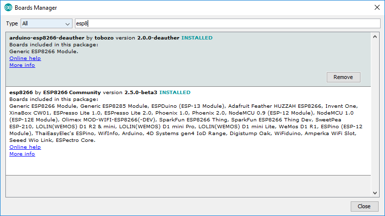 Pastikan board esp8266 by ESP8266 Community dan arduino-esp8266-deauther by tobozo telah terinstall. Jika belum berstatus INSTALLED. Maka install terlebih dahulu