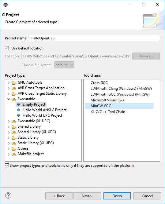 Pertama, bikin Project baru C/C++ melalui menu File > New > C/C++ Project. Lalu pilih C++ Managed Build. Pada Project name, beri nama project, misalnya HelloOpenCV3. Pada Project Type, gunakan Executable > Empty Project, lalu pilih MinGW GCC sebagai toolchains