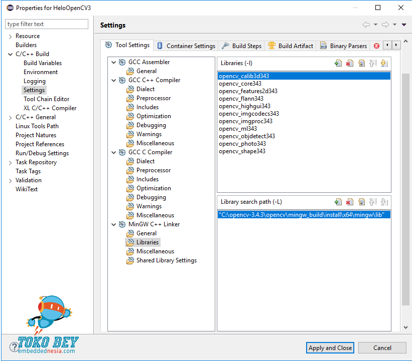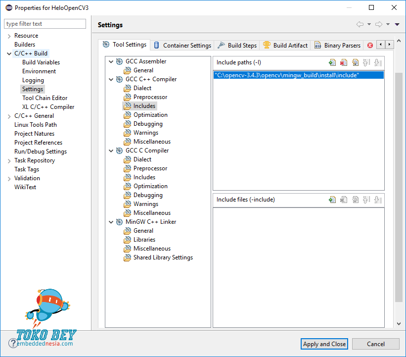 Jika semua sudah oke, Klik button Apply and Close. Perhatikan, kini pada bagian Includes, telah masuk path library OpenCV