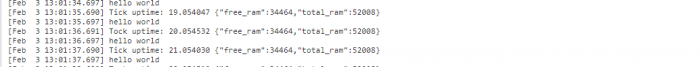 Perhatikan mulai pada baris 23 terdapat fungsi yang mengendalikan nyala LED dan mengeluarkan log pada console di web-ide. Saya memodifkasi fungsi tersebut pada baris 27 dengan perintah untuk menampilkan string “hello world” pada logger. Setelah selesei melakukan perubahan, klik button save dan reboot, lalu perhatikan, perubahan yang dibuat akan muncul di log.
