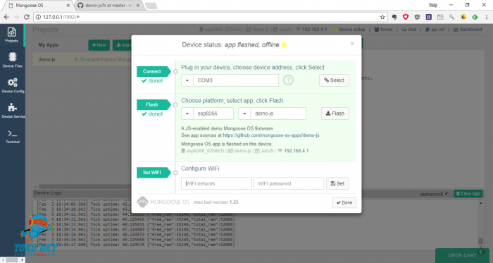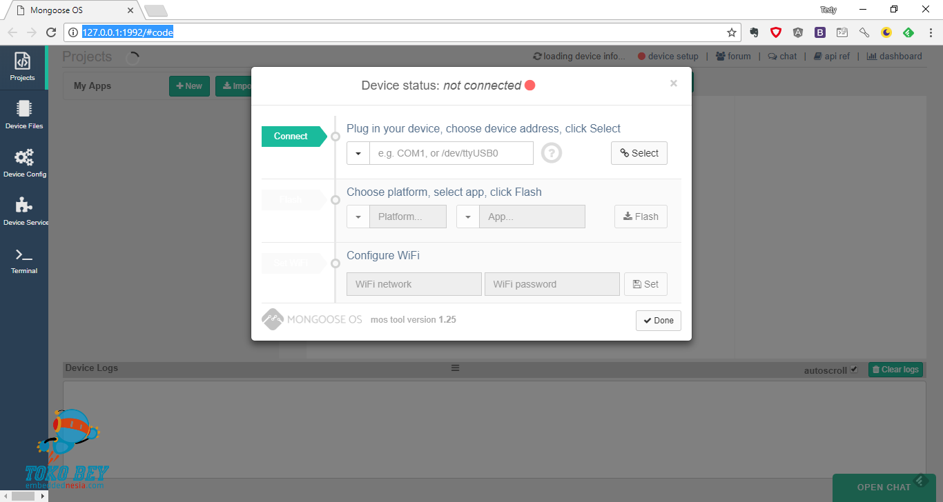 Mongoose OS bisa diunduh dari situs resminya, klik disini, untuk mengakses halaman download dari MongooseOS. Sesuaikan dengan sistem Operasi yang digunakan. Aplikasi ini tidak memerlukan instalasi, anda hanya perlu mengklik dua kali file mos.exe, setelah itu sebuah Web UI akan terbuka pada browser di alamat 127.0.0.1:1992
