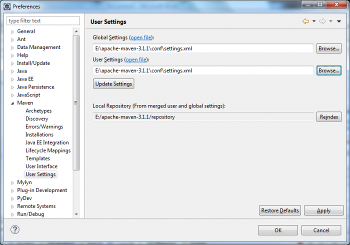 Pilih instalasi maven yang tadi ditambakan lalu klik Apply. Kemudian pada bagian User Settings pillih settings.xml yang digunakan. Gunakan setting pada maven eskternal yang telah di-instal