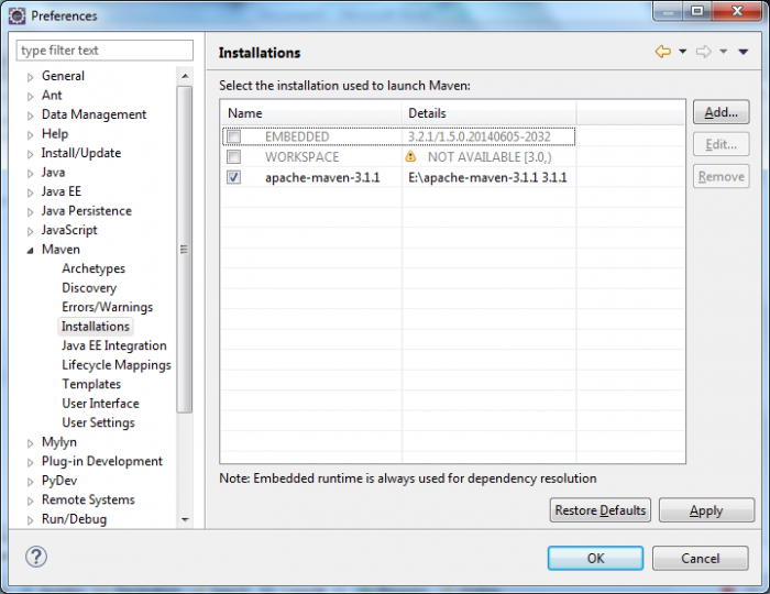 Sebenarnya, Eclipse sendiri sudah dilengkapi Maven bawaan, namun penulis akan mengubahnya dengan maven eksternal yang telah diinstal pada tulisan ini. Pada Eclipse IDE, masuk ke pengaturan Maven melalui menu Preferences > Maven >Installation. Lalu tambahkan Maven Runtime dengan klik button Add sehingga jendela dialog berikut tampil.