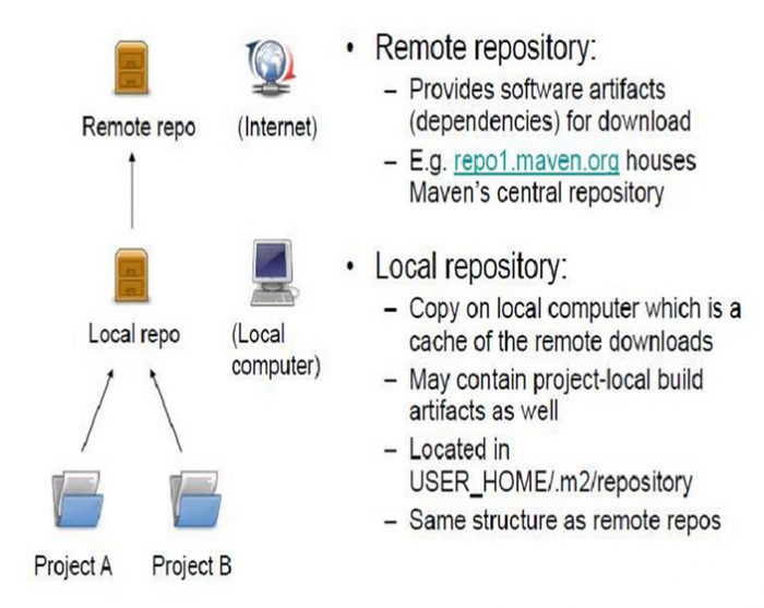 Sedangkan diagram berikut menggambarkan bagaimana maven berfungsi sebagai repositori lokal yang menyimpan salinan dari remote repository yang berada di internet. Programmer hanya perlu menuliskan dependensi yang dibutuhkan ke dalam file xml yang bernama pom.xml