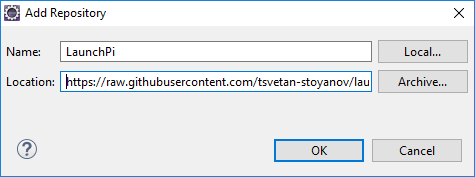 Begitu  jendela utama Eclipse terbuka. Install Plugin LaunchPi melalui menu Help > Install New Software. Pada kotak dialog Install New Software, tambahkan repositori dengan klik button Add lalu tambahkan link berikut Pada field Location. Kemudian Klik OK