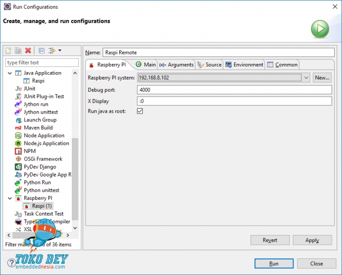 Untuk menjalankan program, langkah pertama adalah mengatur konfigurasi eksekusi software pada Run Configurations sehingga terbuka jendela seperti berikut. Pilih Raspberry Pi.