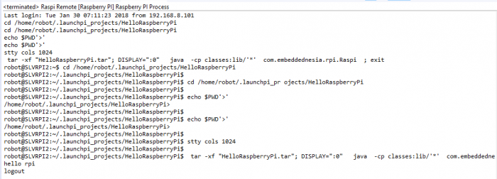 Perhatikan pada terminal di eclipse, aplikasi hello world yang telah dibuat dijalankan pada platform target Raspberry Pi