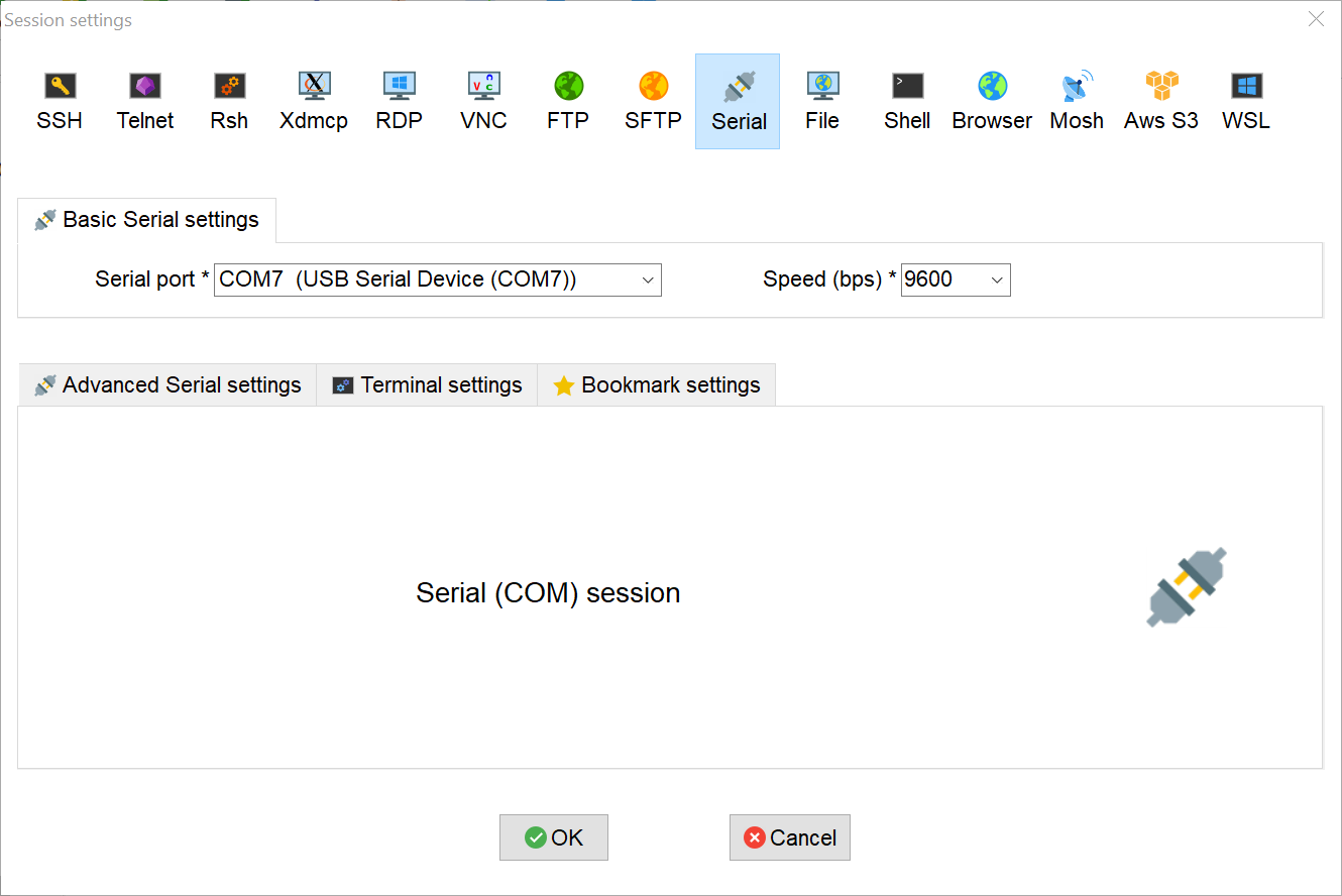 Dalam tulisan ini, digunakan MobaXTerm. Pembaca dapat mengunduhnya pada tautan ini. Saat aplikasi MobaXterm telah berjalan, klik Session yang ada di pojok kiri atas lalu pilih Serial. Kemudian isikan Serial Port yang dihubungkan. Setelah itu klik OK.