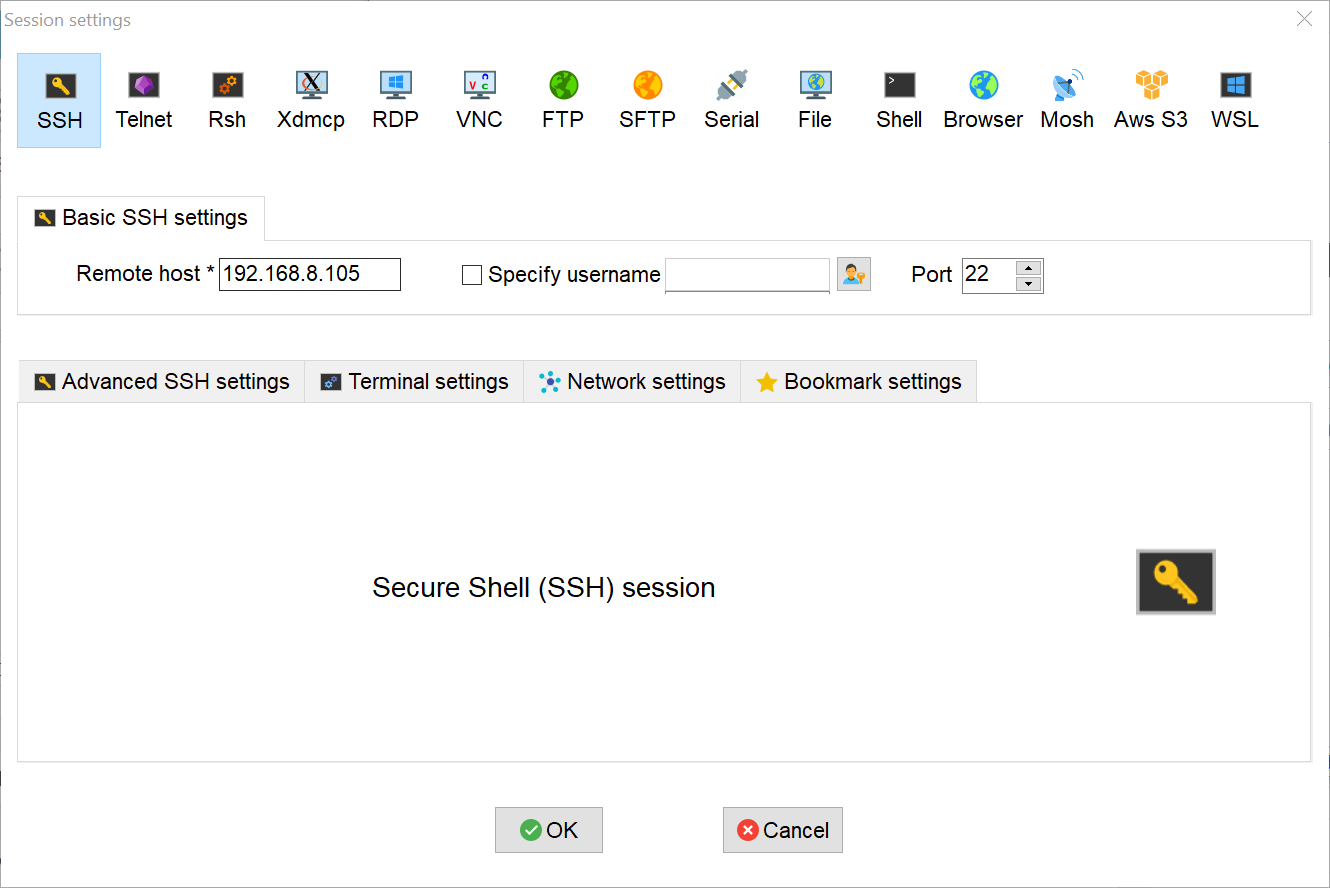 Setelah diketahui alamat IP dari Jetson Nano, jalankan aplikasi SSH Client, seperti Putty atau MobaXTerm, Pada tutorial kali ini, penulis menggunakan aplikasi MobaXTerm. Pilih menu session, dan pilih SSH lalu masukkan alamat IP Jetson Nano pada Remote Host lalu klik OK