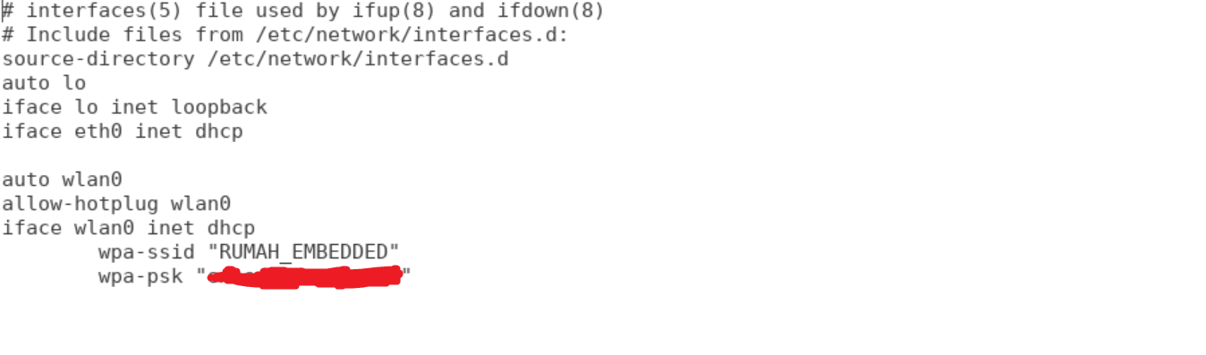 Perhatikan, bahwa wpa-ssid diisi dengan nama SSID wifi yang digunakan, saya menggunakan SSID dengan nama “RUMAH_EMBEDDED” dan password diisikan pada wpa-password dengan diapit tanda kutip. Save dengan ctrl – s.