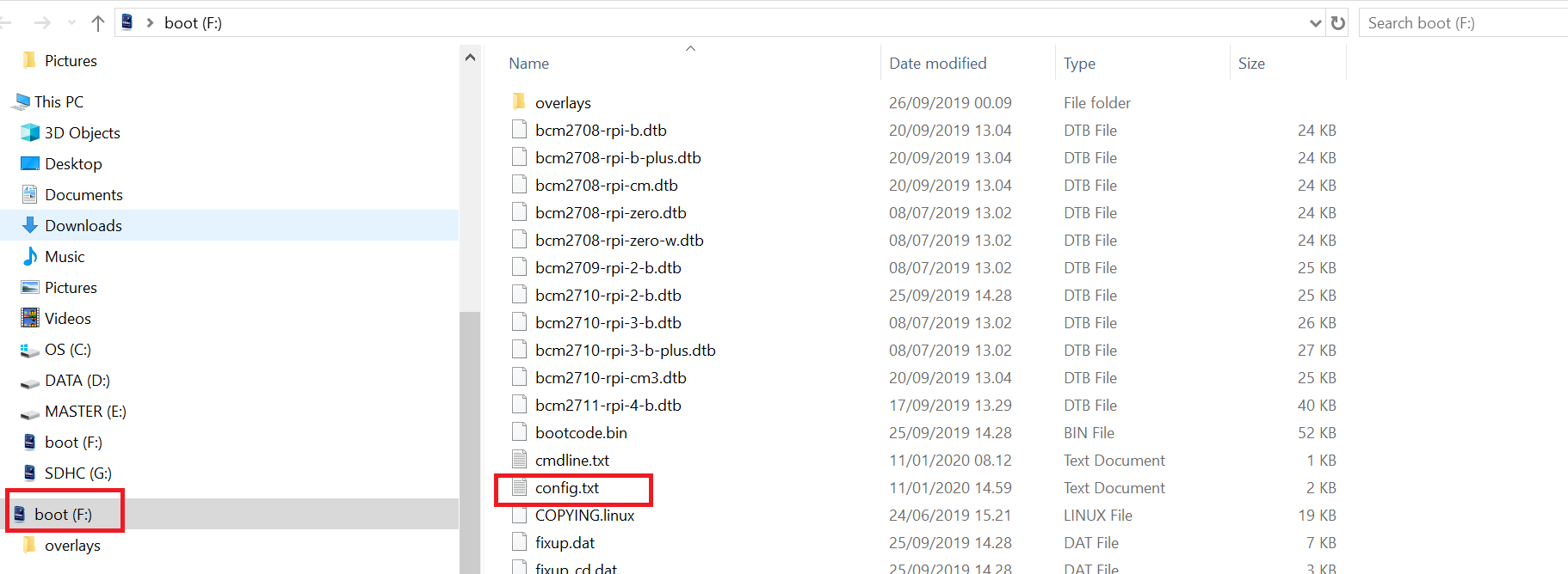 Cara ini cocok digunakan ketika pengguna pertama kali mensetup dan booting Raspberry Pi namun tidak mempunyai akses lain selain menggunakan komunikasi serial via kabel konsol (misalnya lewat keyboard usb dan port HDMI). Pengguna dapat terlebih dahulu mengedit direktori /boot/config.txt pada micro sdcard sebelum dimasukkan pada slot Raspberry Pi mengguna text editor seperti notepad.