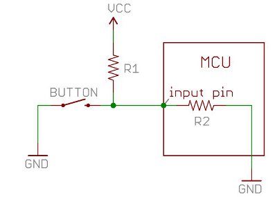 Biasanya pin input memiliki impedansi dapat bervariasi antara 100kΩ, – 1MΩ. Jadi ketika button tidak ditekan, sejumlah arus yang kecil akan mengalir dari VCC melewat R1 dan masuk ke pin input. Resistor pull-up R1 dan pin impendansi input R2 akan membagi tegangan dan tegangan tersebut haruslah cukup besar agar pin input terbaca pada kondisi HIGH