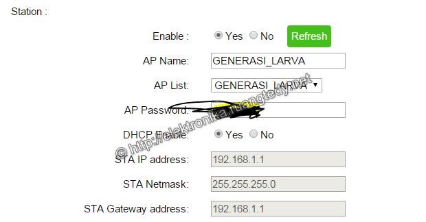 Pertama, lakukan pengaturan konfigurasi shield melalui alamat http://192.168.4.1/. Seletalh sebelumnya terhubung dengan DoitWIFI_Config. Lalu perhatikan di bagian Station dan ubah menjadi radio button menjadi posisi Enable. Pada field AP Name dan AP Password isikan dengan nama akses point dan password router wifi.
