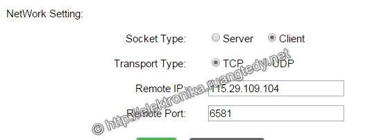 Karena kali ini shield akan bertindak sebagai client (bukan server sebagaimana tutorial sebelumnya) maka pada bagian Network Setting saya mengubah Socket Type menjadi Client, dan mengatur Remote IP dan Remote Port dengan nilai yang telah dicatat sebelumnya, saya menggunakan 115.29.109.104 dan port 6581.