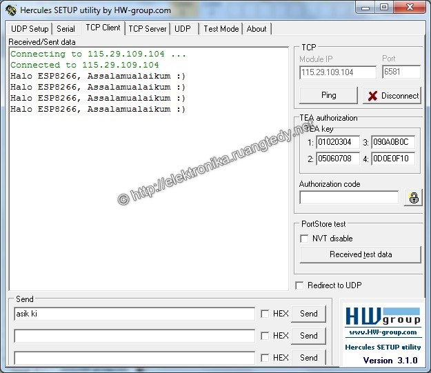 Untuk melihat data yang dikirim shield, gunakan Hercules dan pada bagian TCP Client Isi IP dan Port yang sesuai dengan pengaturan pada tcp.doit.am , lalu klik connect, jika berhasil akan didapatkan hasil seperti gambar. Perlu diingat karena eksperimen ini menggunakan jaringan internet, maka PC anda tidak harus berada satu jaringan dengan shield arduino sebagaimana tutorial sebelumnya. Anda bisa mengaksesnya dari belahan bumi manapun selama memiliki konektifitas internet 😉