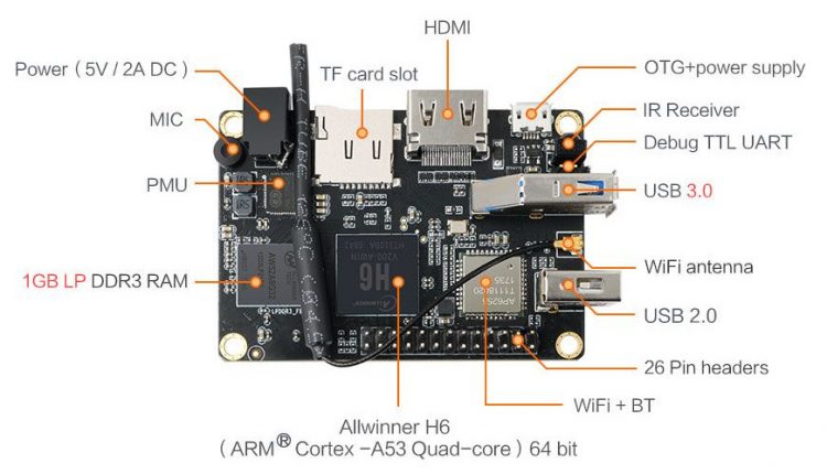 - SoC – Allwinner H6 V200 quad core Cortex A53 processor with Arm Mali-T720MP2 GPU