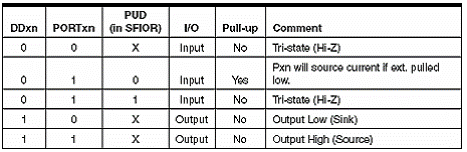 Hasil setting ini berpengaruh pada nilai register DDRxn, dan PORTxn.