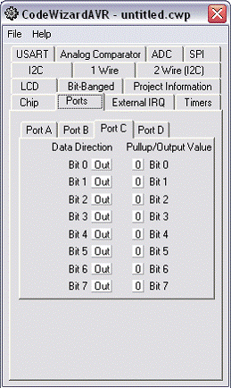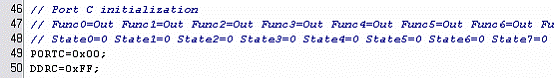DDRC = 0xFF yang berarti 8 bit port C difungsikan sebagai output. PORTC = 0x00 berarti nilai awalan output adalah 0(low).Jika yang anda setting adalah PortB maka DDRB yang bernilai 0xFF,dan PORTB = 0x00 sesuaikan dengan hasil pengaturan pada wizard