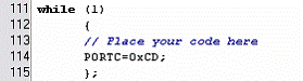 2. Nilai register PORTC diatas adalah nilai awalan pada saat mikrokontroller start-up, kita bisa mengubah nilai output port C dengan mengubah nilai register PORTC pada looping while.