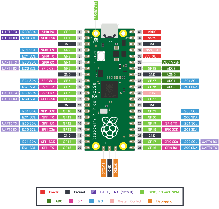 Raspberry Pi Pico dirancang sebagai board yang berguna memperluas fungsionalitas dari RP2040 dan kemudahan programmer untuk mengakses sebagian besar fiturnya termasuk pin – pin GPIO, yang memiliki skema pinout sebagai berikut