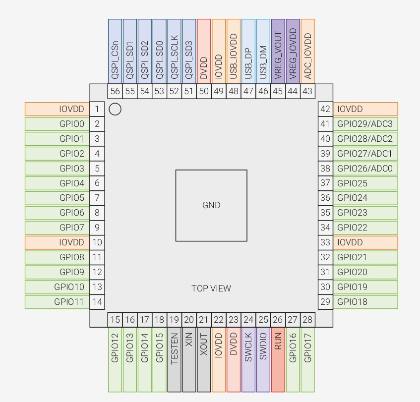 Sedangkan pinout diagram dari mikrokontroler RP2040 adalah sebagai berikut