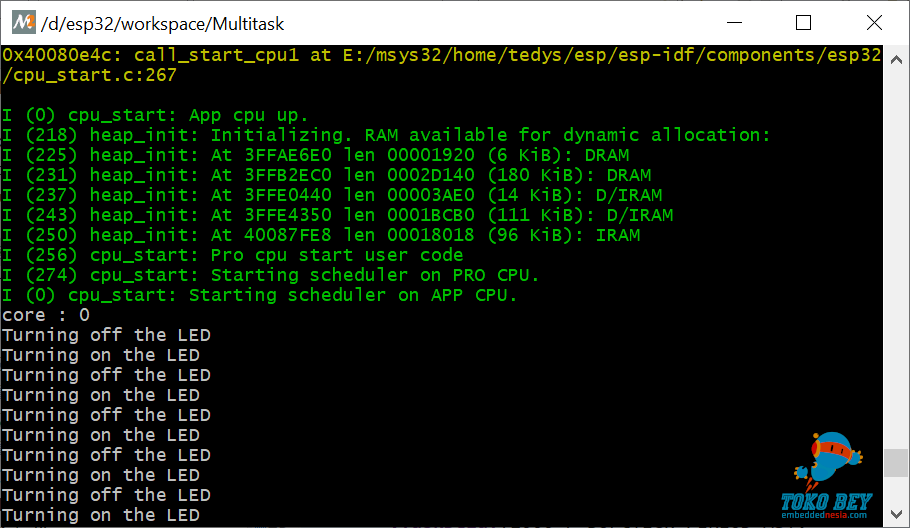 Perhatikan pada konsol, core yang sedang dijalankan untuk logika tersebut adalah core 0. Selebihnya program akan berjalan sama dengan program Blinky sebagaimana telah dibahas dalam tulisan sebelumnya