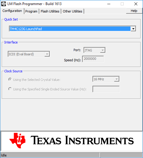 Jalankan LMFlashProgrammer. Pada tab Configuration atur Quick Set ke TM4C123G seperti gambar