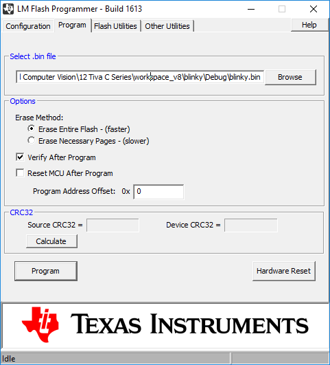 Begitpun untuk mikrokontroler Tiva C Series, Program blinky yang telah dibuat di Code Composer Studio (CCS) dan telah dicompile/build, menghasilkan file binary .bin yang berisi instruksi bahasa mesin yang dapat langsung ditanamkan ke dalam mikrokontroler. Untuk mentransfer kode mesin dari komputer ke mikrokontroler Tiva C Series , Texas Instruments telah menyediakan LMFlashProgrammer, yang pernah diulas pada tulisan sebelumnya.